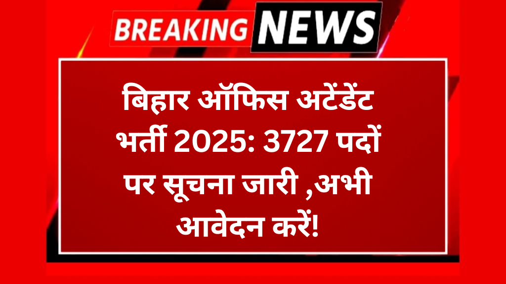 बिहार ऑफिस अटेंडेंट भर्ती 2025: बिहार कर्मचारी चयन आयोग ने ऑफिस अटेंडेंट के 3727 पदों पर सूचना जारी की है| जिसके आवेदन 24 सितंबर 2025 तक भरे जाएंगे| चयन लिखित परीक्षा तथहा मेडिकल परीक्षा से होगा| उम्मीदवार नीचे पढ़कर भर्ती का विवरण, महत्वपूर्ण तिथियां तथहा चयन की सारी जानकारी प्राप्त कर सकते हैं|
